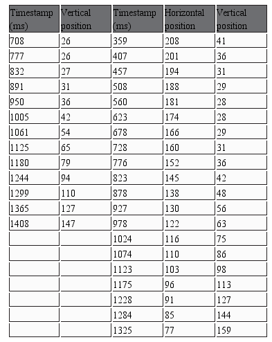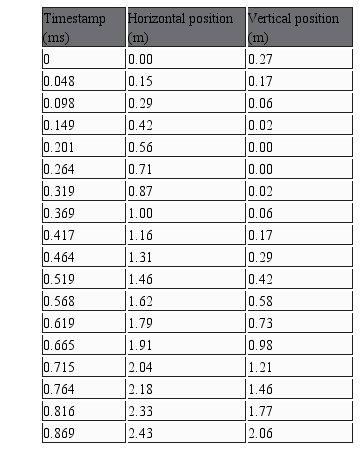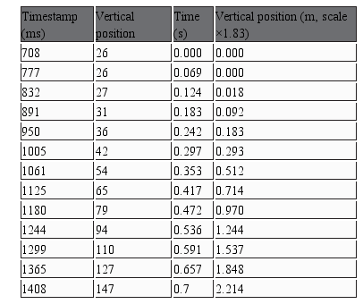 The following table (Table 3) shows the ball positions as a function of time, as retrieved from the pictures taken at regular intervals. Space coordinates were transformed into real space dimensions using the scale factor of 2.07, calculated from the height of the ball thrower, and referred to the reference drawn in Figure 4.