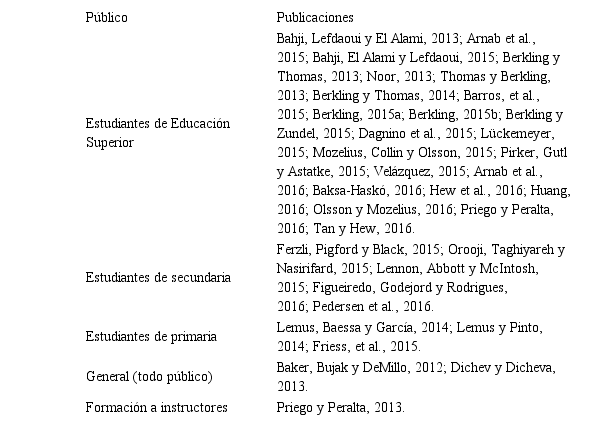 Entre las publicaciones revisadas, el 67% utiliza en las investigaciones muestras referidas a estudiantes de educación superior, destacándose un 38% de estudiantes de ingeniería, frente a un 23% de estudiantes de diversas ramas del conocimiento y un 6% de estudiantes exclusivamente de ciencias sociales. Por otra parte, un 15% son publicaciones orientadas a la educación secundaria, un 8% a educación primaria, un 5% de carácter general para todo público, y un 3% se dirige a la formación de formadores.