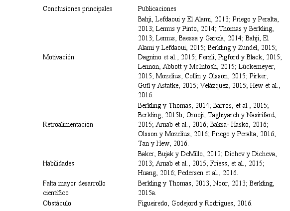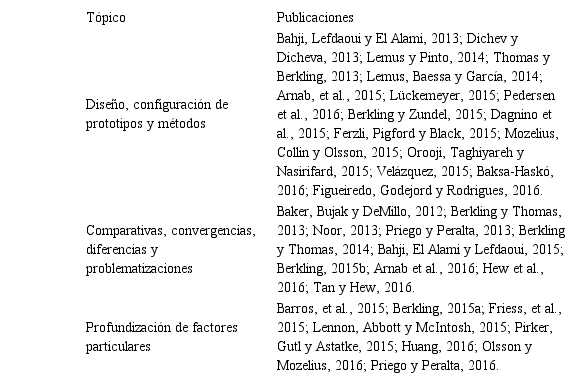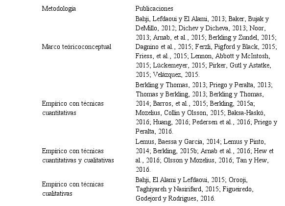 Se consideraron 49 publicaciones, 23 de Web of Science (WOS) y 26 de Scopus, siguiendo la estrategia de búsqueda descrita, de las que 15 publicaciones pertenecientes a revistas científicas y actas de conferencias indexados en ambas bases de datos se encuentran reiteradas (Arnab, Bhakta, Merry, Smith, Star, y Duncan, 2016; Arnab, Tombs, Duncan, Smith, y Star, 2015; Baker, Bujak y DeMillo, 2012; Berkling, 2015; Dagnino, Antonaci, Ott, Lavagnino, Bellotti, Berta, y De Gloria, 2015; Dichev y Dicheva, 2013; Friess, et al., 2015; Hew, Huang, Chu, y Chiu, 2016; Huang, 2016; Lennon, Abbott y McIntosh, 2015; Lückemeyer, 2015; Mozelius, Collin y Olsson, 2015; Preigo y Peralta, 2013; Tan y Hew, 2016; Velázquez, 2015). Por lo tanto, la muestra de este estudio ha constado de 34 publicaciones. Por su parte, el hecho de que las publicaciones en conferencias superen a las revistas científicas acontece cuando se trata de estudios en proceso de desarrollo con material preliminar, que se canaliza hacia temas innovadores (Drott, 1995).