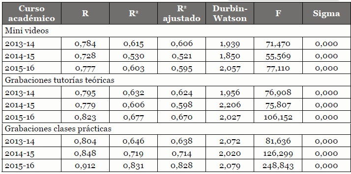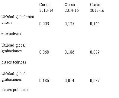 Teniendo en cuenta que cuanto mayor sea el coeficiente beta (en valor absoluto) más importancia tendrá la variable correspondiente, podemos concluir que, en el primer curso académico del estudio, tuvo más influencia la utilidad global de las grabaciones de las clases prácticas; en el segundo curso académico fueron las grabaciones de las clases teóricas y, en el último curso académico, fueron los mini videos interactivos los que más éxito tuvieron.