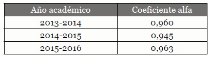 El cuestionario se puso a disposición de los alumnos a través de la plataforma Google Drive por su facilidad de administración, cuantificación y evaluación por parte del encuestador y por su sencillez de uso para el encuestado. La validez del cuestionario aplicado a esta investigación se ha realizado a través de la prueba de Alfa-Cronbach que analiza si los ítems utilizados, de acuerdo con una escala Likert, están correlacionados (Ritter, 2010). Los valores del coeficiente alfa basado en elementos estandarizados se presentan en la siguiente tabla.