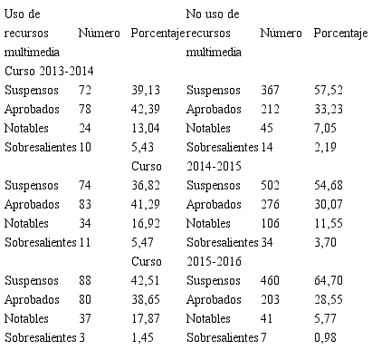 El análisis de los resultados académicos a través de medidas estadísticas de tipo descriptivo muestra que los estudiantes que accedieron a los distintos recursos multimedia (mini videos interactivos, grabaciones de tutorías de tipo teórico y grabaciones de clases prácticas) obtuvieron durante los tres cursos académicos analizados mejores calificaciones que aquellos alumnos que no lo hicieron. Esa mejora del rendimiento se tradujo en una calificación media más alta, en un mayor porcentaje de aprobados y un menor número de suspensos. Además, entre los aprobados se obtuvieron mejores calificaciones en los distintos tramos evaluativos.