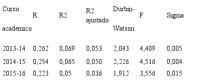 La variable R2 nos indica que las tres variables independientes del modelo explican la calificación obtenida por el alumno en un 6,9% el primer año, descendiendo ligeramente en el segundo y alcanzando el nivel del 5% en el último año. En lo que se refiere al parámetro de Durbin-Watson, observamos que los residuos son independientes ya que, en todos los cursos analizados, el valor obtenido se sitúa entre 1,5 y 2,5 (la independencia de los residuos es uno de los supuestos básicos del modelo de regresión lineal).
