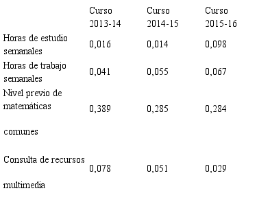 Para la variable horas de estudio semanales, la ponderación ha sido de 1 para el intervalo 0-5 horas, de 2 para el intervalo 6-10 horas y 3 cuando se estudiaban más de 10 horas a la semana. Para la variable horas de trabajo semanales, se ha ponderado con valor 1 si la ocupación laboral suponía menos de 15 horas, con valor 2 para el intervalo 16-25, con valor 3 para el intervalo 26-40 horas y con valor 4 si se trabajaba más de 40 horas a la semana. La tercera variable independiente (nivel de matemáticas) se ha ponderado con valor 1 si se declaraba un nivel de conocimientos inferior a 5, con valor 2 si el nivel declarado se situaba entre 5 y 7 y un valor de 3 para el intervalo 7-10. Por último, la consulta de los recursos multimedia se ha ponderado con valor 1 si se consultaban y 0 si no se consultaban. En cuanto al rendimiento académico, la ponderación se ha realizado asignando un valor 0 a la calificación más baja y un valor 10 a la calificación más alta.