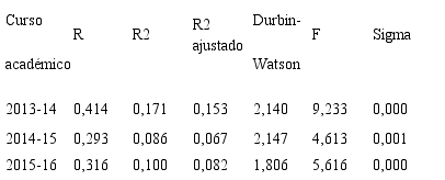 El cálculo de R2 indica que las cuatro variables independientes del modelo explican la calificación obtenida por el alumno en un 17,1% el primer año, descendiendo en el segundo y quedando en un 10% en el último año. No existe un alto grado de dependencia lineal entre las variables y tampoco los residuos son dependientes.