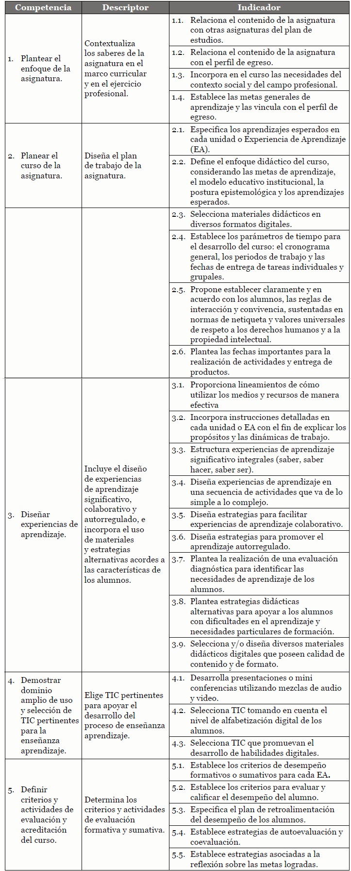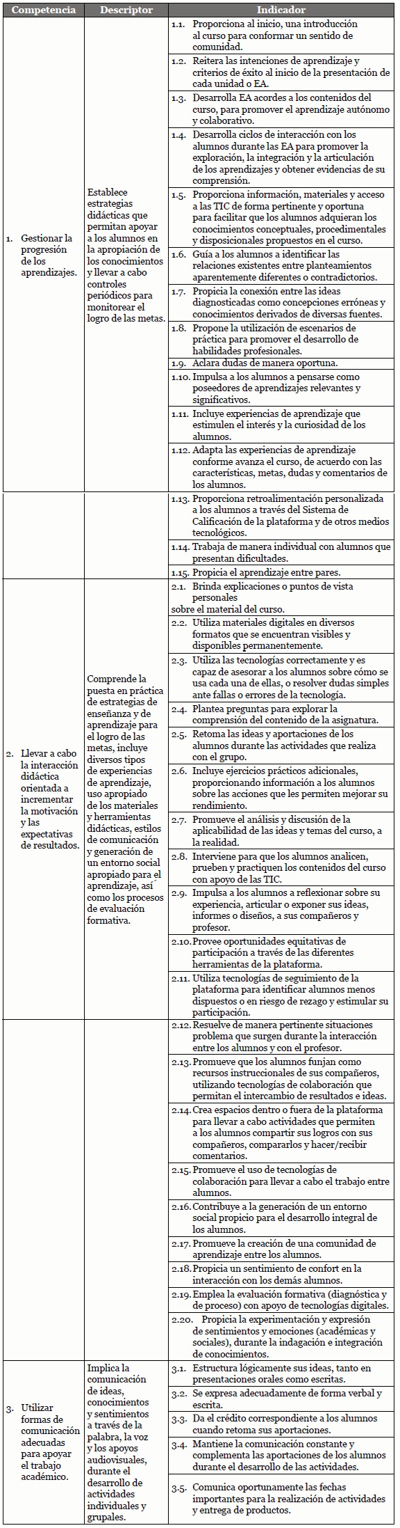 Con base en el análisis de los datos provenientes de los expertos y de los docentes en línea, así como su contraste con la literatura, se elaboró la última versión del MECDL. Esta versión quedó integrada por las tres dimensiones: previsión del proceso enseñanza-aprendizaje que incluye cinco competencias y 27 indicadores; conducción del proceso de enseñanza-aprendizaje con tres competencias y 40 indicadores; y valoración del impacto del proceso enseñanza-aprendizaje integrada por una competencia y 6 indicadores, mismas que se describen a continuación, lo cual arroja un total de 8 competencias y 73 indicadores.