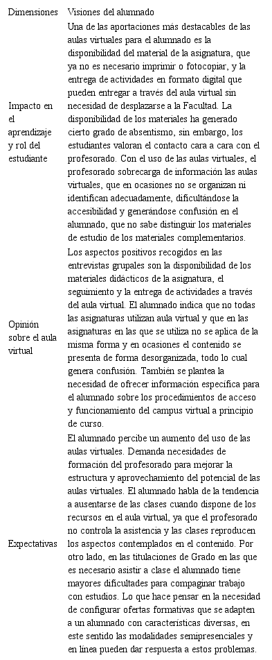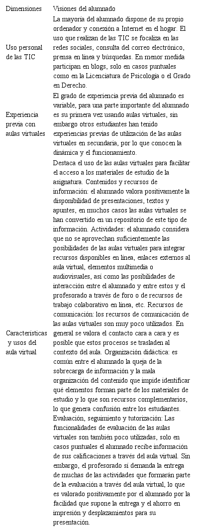 Las aulas virtuales, en los casos analizados, se conciben principalmente como espacios digitales de complementarios de la docencia presencial y aunque el alumnado valora positivamente su existencia (sobre todo para acceso a los materiales de estudio y como mecanismo de entrega de tareas y trabajos), demanda un mayor desarrollo en la dimensión de comunicación así como una mayor organización y calidad de los materiales de estudio.