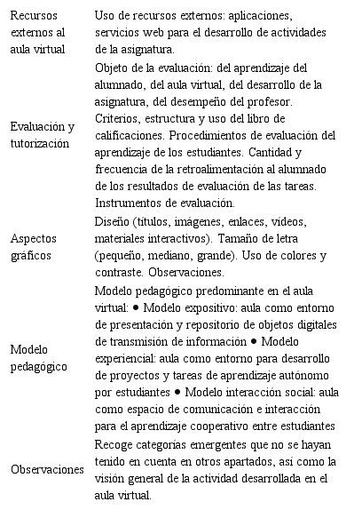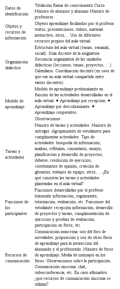 La recogida de datos para el análisis de las aulas virtuales se realizó a través de un instrumento de observación, específicamente creado por los autores para este tipo de aulas virtuales, que puede verse en el Anexo 1. El proceso de construcción y validación de este instrumento fue realizado a través de estudios previos desarrollados en años anteriores donde se exploraron diferentes muestras de aulas virtuales del Campus Virtual de la ULL en los que se fue contrastando y afinando el instrumento (Area, San Nicolás y Fariña 2008; 2010; Fariña, González, y Area, 2013). Las dimensiones contempladas en el mismo son las siguientes: datos de identificación, objetos digitales y recursos de información, organización didáctica, modelo de aprendizaje, tareas y actividades, recursos de comunicación, recursos externos, funciones de los participantes, evaluación y tutorización, los aspectos gráficos, así como el modelo pedagógico.