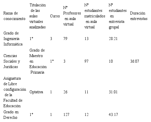 El criterio inicial de selección de la muestra fue buscar profesorado que hubiera participado en varias convocatorias de los Proyectos de Docencia Virtual (PRODOVI) convocados por la UDV. En este proceso surgieron algunas dificultades, ya que algunos profesores no estaban dispuestos a dar acceso a sus aulas virtuales y tampoco a permitir el acceso al alumnado para el desarrollo de las entrevistas grupales. Finalmente, se consiguió el permiso y colaboración del profesorado de 12 asignaturas de distintas titulaciones de Grado en la ULL, de modo que pudimos acceder a las aulas virtuales y a los estudiantes inscritos en las mismas. Los datos concretos de cada uno de estos casos pueden verse en la tabla 1.