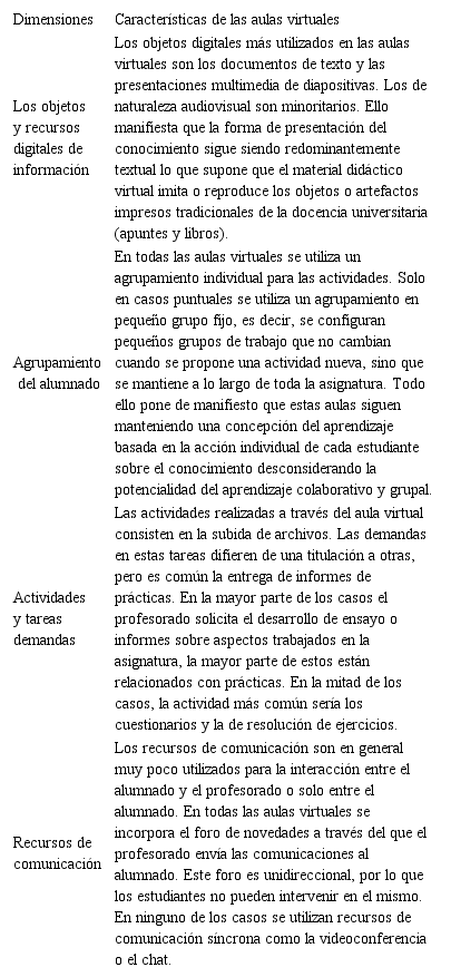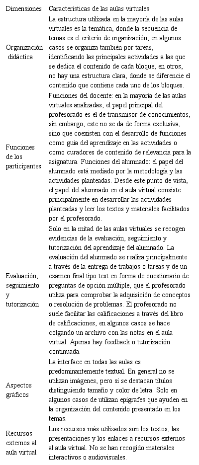 La principal funcionalidad o utilidad didáctica de las aulas virtuales es albergar los materiales didácticos de estudio de la asignatura y facilitar un espacio para recopilar las tareas que el alumnado debe desarrollar. Los procesos comunicativos solo se realizan en pocas aulas virtuales y de forma esporádica, pero no es el objetivo principal. La estructura utilizada en las aulas virtuales es temática, siguiendo en general una secuencia que responde a la de los temas de la asignatura. Sin embargo, también hay casos que, aunque utilizan esta estructura, dedica cada uno de los bloques a diferentes tipos de actividades relacionadas con la temática, organizando, por ejemplo, los contenidos teóricos principales en un bloque diferenciado de los materiales complementarios.