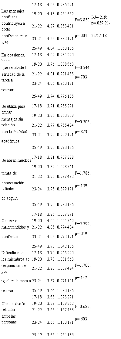 Por último, el alumnado de edades de 21-22 años presentó diferencias significativas con el grupo de 17-18 años (I-J=.219, p=.039) en lo relativo a que “Los mensajes confusos contribuyen a crear conflictos en el grupo” (F=3.830, p=.004).