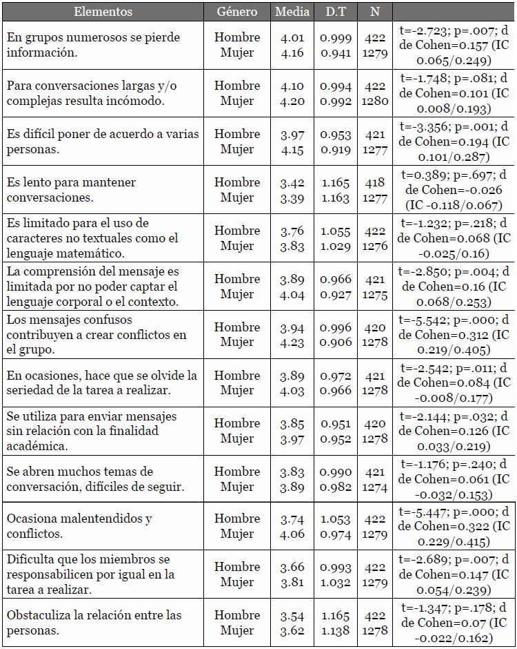 Atendiendo al género, se obtuvieron diferencias en 8 de los 13 ítems (véase la tabla 8), en los cuales presentaban valores más altos las mujeres que los hombres en todos los casos, siendo estos: “En grupos numerosos se pierde información” (t=-2.723, p=.007, d=0,157), “Es difícil poner de acuerdo a varias personas” (t=-3.356, p=.001, d=0.194), “La comprensión del mensaje es limitada por no poder captar el lenguaje corporal o el contexto” (t=-2.850, p=.004, d=0.16), “Los mensajes confusos contribuyen a crear conflictos en el grupo” (t=-5.542, p=.000, d=0.312), “En ocasiones, hace que se olvide la seriedad de la tarea a realizar” (t=-2.542, p=.011, d=0.084), “Se utiliza para enviar mensajes sin relación con la finalidad académica” (t=-2.144, p=.032, d=0.126), “Ocasiona malentendidos y conflictos” (t=-5.447, p=.000, d=0.322) y “Dificulta que los miembros se responsabilicen por igual en la tarea a realizar” (t=-2.689, p=.007, d=0.147).