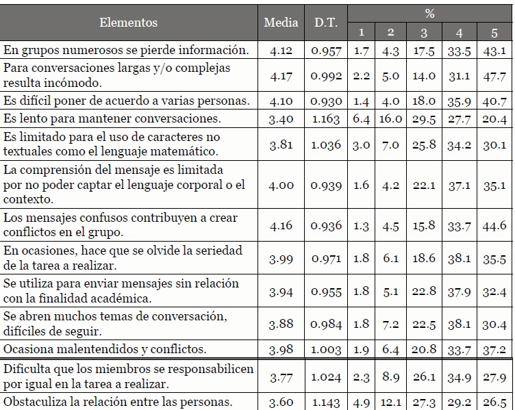 Por el contrario, los aspectos que menos incidencia presentaron para los estudiantes fueron: la posible lentitud para mantener conversaciones a través de WhatsApp (M=3.40: D.T.=1.163), el que pueda obstaculizar las relaciones personales (M=3.60; D.T.= 1.143) y el que dificulte que los miembros se responsabilicen por igual en la tarea a realizar (M=3.77; D.T.= 1.024).