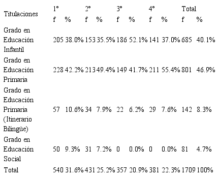Por titulaciones, el 40.1% pertenecían al Grado en Educación Infantil, el 46.9% a Educación Primaria, el 8.3% a Educación Primaria con itinerario bilingüe y el 4.7% a Educación Social, siendo la distribución por nivel la que se puede observar en la tabla 2.
