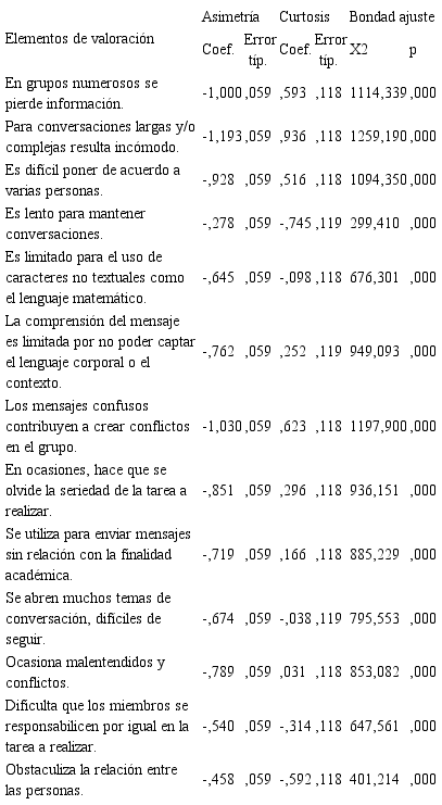 Antes de la aplicación de las pruebas, se comprobó que las variables estuvieran normalmente distribuidas. Los valores aportados por los coeficientes de asimetría (<3.00) y curtosis (<8.00) dieron a entender que existía normalidad univariada de los datos obtenidos (Thode, 2002), estimación reforzada por la bondad de ajuste del modelo estadístico con base en las observaciones realizadas y las consideradas como deseables, asumiendo en los valores escalares un carácter discreto mediante la prueba de chi cuadrado (n.s.=.05) (Rao y Scott, 1981). El contraste resultó ser significativo en todos los elementos propuestos en el instrumento (véase tabla 3).