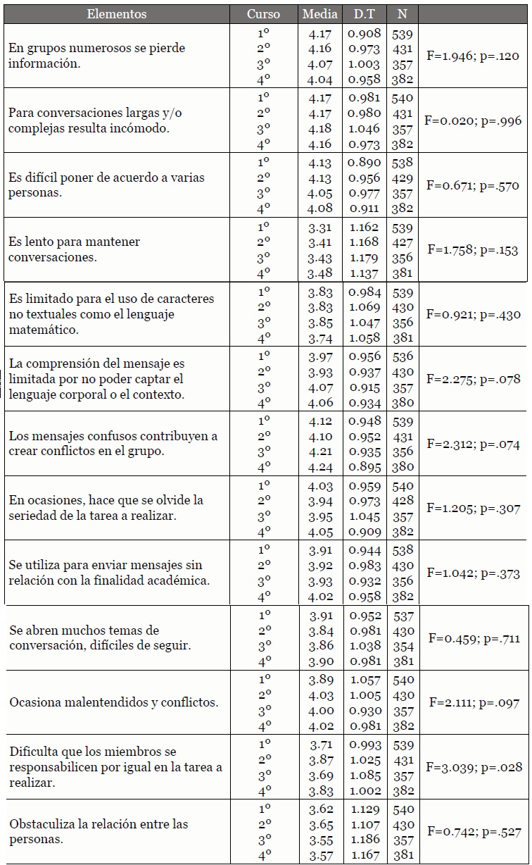 Con respecto al curso académico que realizaban, el análisis de varianza permitió observar que solo existían diferencias en uno de los ítems, “Dificulta que los miembros se responsabilicen por igual en la tarea a realizar” (F=3.039, p=.028), no siendo corroborada por la prueba posthoc de Scheffé (véase la tabla 6).