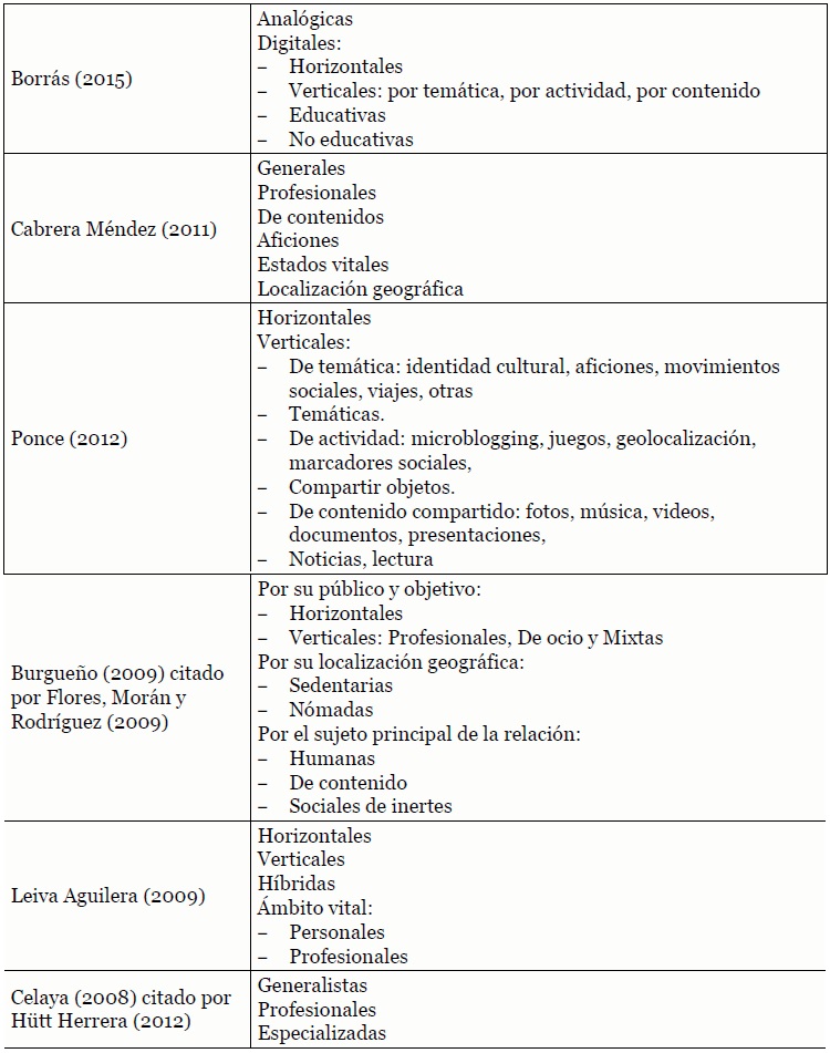 Estas redes sociales se pueden clasificar de diferente forma. Tradicionalmente se han agrupado en base a si eran generalistas, profesionales o especializadas (Celaya, 2008). En la actualidad se utilizan otro tipo de criterios para catalogarlas (tabla 1), pudiendo ser horizontales o sin temática definida, dirigidas a todo tipo de usuarios; verticales, en donde los usuarios se reúnen en torno a una temática, actividad o contenido; educativa vs. no educativa; de estados vitales; etc. (Martínez-Guerrero, 2018).