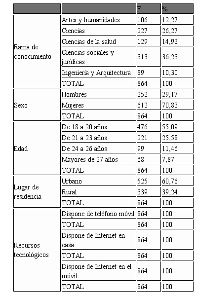 Para la realización de esta investigación, hemos contado con la participación de 864 estudiantes, de los cuales la mayoría son mujeres (70,83%) de entre 18 y 20 años (55,09%), estudian algún grado relacionado con las Ciencias Sociales y Jurídicas (36,23%) y la mayoría viven en un entorno urbano (60,76%). Además, todos los participantes disponen de teléfono móvil, así como conexión a Internet desde casa y desde el móvil (ver tabla 1).