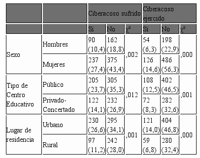 Los resultados muestran que existen diferencias significativas entre el ciberacoso sufrido y el ejercido por los participantes y el sexo (p=0,002 y p=0,000 respectivamente), el tipo de centro educativo (p=0,012 y p=0,001) y el lugar de residencia (p=0,001 y p=0,000).