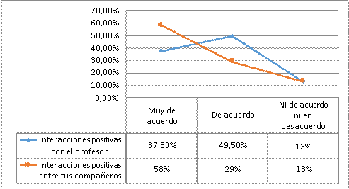 Uno de los resultados más positivos de esta intervención se refiere a las interacciones docente-estudiante, estudiante-estudiante pues los resultados más altos corresponden a este rubro. En cuanto a las relaciones entre iguales, 58% manifiesta estar “muy de acuerdo” y el 29% estar “de acuerdo” en que la metodología implementada aumentó las relaciones positivas entre sus compañeros de clase.