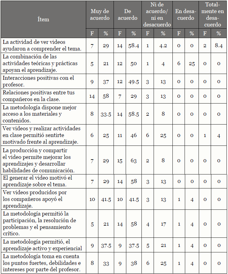 En el instrumento para recoger la información, se utilizó el cuestionario tipo escala de Likert diseñado y adaptado a partir de la propuesta de García y Rodríguez (2016), que consideran las categorías de: percepción de la metodología respecto al aprendizaje; interacción docente-estudiante, estudiante-estudiante; ritmos de aprendizaje; colaboración; resolución de problemas y motivación. Además, se agregaron cinco preguntas adicionales para detectar la actitud del estudiante a la creación de contenido y el grado de aceptación del modelo y estrategia promotora de prosumidores.