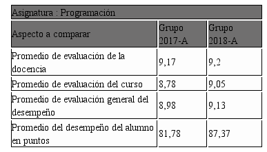 Su calificación en puntos aumentó un 5.5% el promedio grupal del desempeño del alumno con respecto al grupo anterior donde no se aplicó dicha metodología; además, se observa un incremento del 2.7% en el promedio de la evaluación del curso en la valoración que realizaron los estudiantes sobre el profesor en el curso. Estos resultados se muestran en la tabla 2.
