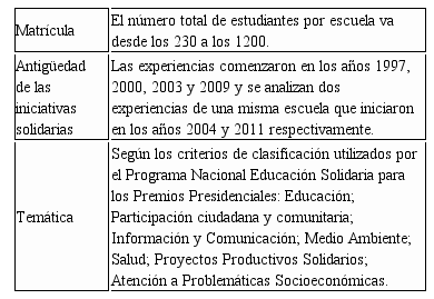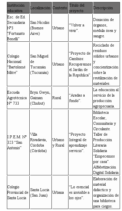 Concretamente, se seleccionaron cinco experiencias de entre las más de 50 centros distribuidos en las 24 provincias argentinas y cuyos proyectos de ApS fueron reconocidos por el Programa Nacional Educación Solidaria del Ministerio de Educación y que, además, formaban parte del Programa de Apoyo de CLAYSS. Para dar cuenta de la diversidad de contextos donde se desarrollan los proyectos, se decidió seleccionar centros ubicados tanto en zonas urbanas como rurales, y en diferentes provincias argentinas: Buenos Aires, Chubut, Córdoba, San Juan y Tucumán. También se consideraron otros aspectos, tal y como recoge la tabla siguiente.