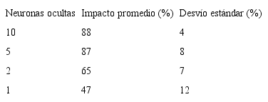 La variabilidad de los impactos fue pequeña para 5 y 10 neuronas ocultas y se incrementó con menos neuronas ocultas. Por otra parte, el impacto del modelo resultó dependiente de la cantidad de neuronas ocultas, como muestra la tabla 8.