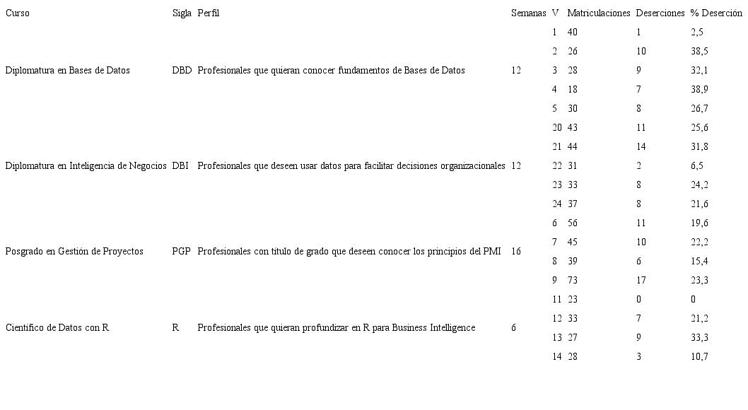 Los conjuntos de datos usados en este trabajo provienen de cuatro cursos virtuales dictados por la SCEU UTN.BA durante 2018 y 2019. Se eligieron específicamente los consignados en la tabla 1 por una cuestión de posibilidad institucional de acceso a la información. Sus duraciones son diferentes y atraen a personas de los más diversos orígenes profesionales. En conjunto, se registraron en la plataforma 591 individuos. Sin embargo, el total de matriculaciones en cursos por parte de estudiantes fue de 654, pues algunos estudiantes tomaron más de una de las capacitaciones consideradas en este trabajo. En esa cantidad de matriculaciones hubo 141 deserciones. En el caso de cursar más de uno, hay estudiantes que pudieron abandonar un curso y no otro.