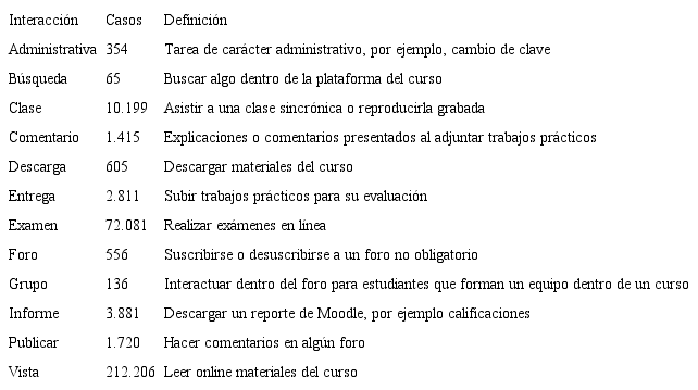 En total, para los cuatro cursos y todas sus versiones, había en los registros de Moodle 314.783 interacciones. De esas, 8.754 se descartaron porque no figuraba información sobre el causante de la interacción. Quedaron entonces 306.029, de las cuales 291.132 correspondían a estudiantes. El resto eran de docentes y administrativos, por lo que no eran relevantes para este estudio. Estas interacciones de estudiantes con la plataforma fueron clasificadas en los 12 tipos consignados en la tabla 2.