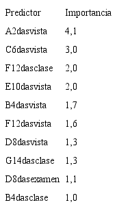 Por otra parte, no tiene sentido para todo algoritmo hablar de la relevancia predictiva de cada atributo en particular. Por ejemplo, en una red neuronal multicapa no resulta evidente en qué medida los diferentes pesos de las diversas capas filtran el efecto de un atributo determinado sobre la predicción de deserción. Sin embargo, para un árbol de decisión se puede extraer sin dificultad la importancia relativa de los atributos para la predicción. Por ejemplo, si con los datos consignados en nuestra tabla de atributos entrenamos un árbol de decisión mediante el paquete R rpart, se puede estimar la relevancia predictiva de cada uno, como se enumera en la tabla 3.