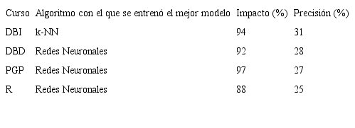Otra de las preguntas de investigación era si el mismo algoritmo servía para ajustar todos los cursos. Sin embargo, es interesante resaltar que, en tres de los cuatro, el mejor modelo se consiguió utilizando una red neuronal. Los mejores modelos hallados para cada curso se sintetizan en la tabla 6.