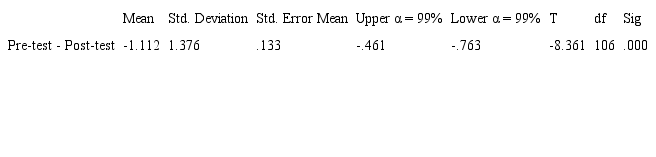 The Student T-test scores demonstrated that significant improvements had been achieved in the TVBR test results, thus the programme implemented had improved the students’ ability to understand computational concepts. The post-test values provided data obtained after the intervention, which underlined the statistically significant differences mentioned (0.000) to a significance level of 99% in the paired samples. In short there are significant improvements regarding computational concepts, as demonstrated in table 3.