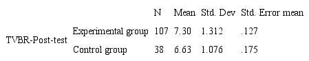 Comparing the control and experimental groups, the homogeneity of the variances is confirmed by Levene’s test, and homoscedascity is assumed in the Maths test (0.267). Based on these values, the p-value in the TVBR test attained a significance of (0.00) to a level of significance of 99%. Therefore, the research hypothesis is proved and the null hypothesis rejected; there were statistically significant improvements in the application of this test, in the elements measured in this quasi-experimental design.