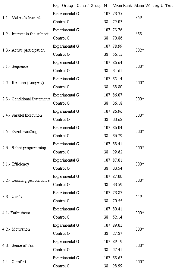 In all cases, there were evident statistically significant improvements in the integration of computational concepts in the unit applied. The control group showed an improvement in their understanding of sequences, loops, conditional statements, parallel execution, event handling and use of robotics, as demonstrated by the Mann Whitney U-Test, as well as in other elements related to sense of fun, enthusiasm, active participation and efficiency.