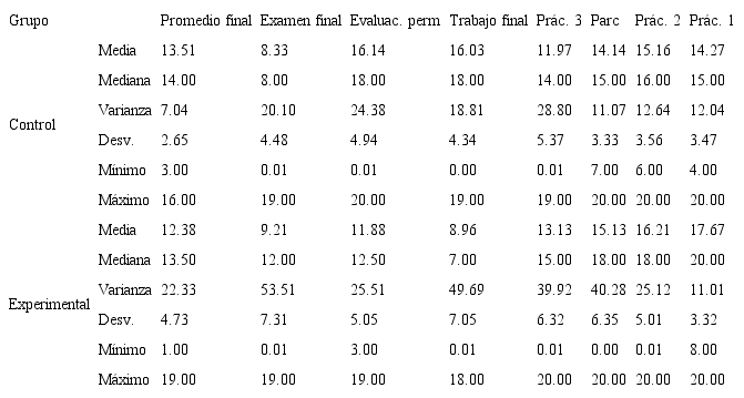 Considerando el trabajo final, se rechaza la hipótesis nula que indica que la distribución de las medias es igual, debido a que p<0.0001; así pues, la diferencia encontrada fue a favor del grupo control, mientras que el tamaño del efecto fue grande debido a que g=1.27. Respecto de la evaluación permanente, se rechaza la hipótesis nula que indica que la distribución de las medias es la misma, debido a que p<0.001, con una diferencia a favor del grupo control. Además, el tamaño del efecto fue grande, debido a que g=0.85.