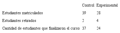 Para el análisis de la deserción, se trabajó con un total de 39 estudiantes asignados para el grupo control, de los cuales fueron 35 hombres y 4 mujeres, mientras que en el grupo experimental se contó con 28 estudiantes, de los cuales fueron 2 mujeres y 26 hombres. Respecto del análisis del rendimiento académico, no se consideraron a los estudiantes retirados, por lo que se contó con un total de 37 estudiantes asignados al grupo control, de los cuales fueron 4 mujeres y 33 hombres; mientras que en el grupo experimental fueron 24 estudiantes, de los cuales fueron 2 mujeres y 22 hombres.