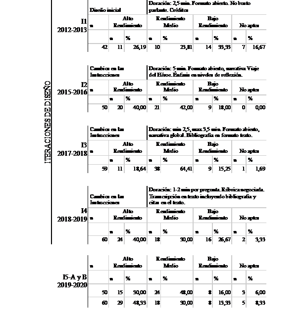Las iteraciones 4 y 5 corresponden a los cursos 2018-2019 y 2019-2020, lo que implica que en el caso de la iteración 5, y por las particularidades organizativas ocasionadas por la crisis del Covid-19, esta tarea de evaluación final fue utilizada como estrategia de evaluación en dos asignaturas.