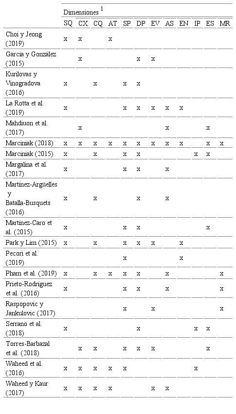Para el análisis de las propuestas actuales se ha realizado una categorización de las dimensiones genéricas que los estudios proponen, tratando de delimitarlas para cada uno de ellos bajo una denominación común y corroborando cuáles son objeto de estudio y cuáles no en cada instrumento de evaluación, y presentando una muestra de todas las dimensiones que afectan a la evaluación de la calidad (tabla 1).