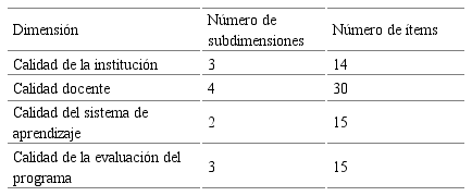 Esta variedad en cuanto a las dimensiones de los distintos modelos, así como la variabilidad presente en sus ítems, hacen que la evaluación de la calidad carezca todavía de una herramienta fiable y aceptada de forma global, por lo que es importante focalizar la investigación en la detección de las actuales dimensiones, subdimensiones e ítems y tratar de aunar todas ellas en un marco común y una herramienta que contemple las distintas perspectivas. (Choi y Jeong, 2019). Las dimensiones y sus múltiples denominaciones se aúnan de forma posterior en cuatro grandes subdimensiones (facilitando la comprensión del modelo), disgregadas en subdimensiones posteriormente. Estas cuatro dimensiones son la calidad de la institución, la calidad docente, la calidad del sistema o plataforma y la evaluación del programa. En la búsqueda de un estándar a la hora de categorizar las dimensiones de la calidad y atendiendo también a los pesos relativos que los estudios analizados dan a cada dimensión, se alcanza la conclusión unánime de los autores de la identificación de cuatro dimensiones principales. Para contar con un mayor nivel de conformidad, el análisis de la propuesta validada de Marciniak y Gairín-Sallán (2017) para la autoevaluación de la calidad confirmó la presencia de cuatro dimensiones principales: organización del programa, diseño del programa (metodológico y docente), desarrollo del programa (cronológico y tecnológico) y evaluación del programa. Por ello, se mantiene la decisión de asumir cuatro dimensiones principales que conformarán el primer modelo diseñado de cara al proceso de validación.