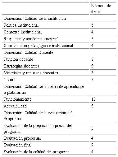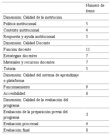 En un metaanálisis llevado a cabo por Marciniak y Gairín-Sallán (2017) sobre diferentes modelos propuestos para la evaluación de la calidad en e-Learning, fueron catorce las dimensiones resultantes como relevantes para la calidad y su evaluación: Justificación del programa virtual, objetivos formativos del programa virtual, perfil de ingreso y egreso, contenido temático del programa virtual, actividades de aprendizaje, perfil del docente en línea, materiales y recursos didácticos (guía, unidad y otros materiales), estrategias didácticas, tutoría, evaluación del aprendizaje, plataforma virtual, evaluación de la fase inicial del programa, evaluación del desarrollo del programa y evaluación final del programa.