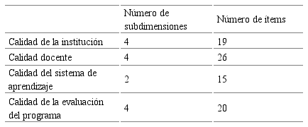 Teniendo en cuenta las aportaciones realizadas por los expertos, se concluyó el diseño del modelo final manteniendo las dimensiones planteadas (en consonancia con lo planteado en el diseño del modelo y con el número de dimensiones planteado por Marciniak y Gairín-Sallán, 2017), incluyendo dos nuevas subdimensiones (una relativa a la coordinación pedagógica e institucional y otra a la evaluación de la calidad del programa) y realizando las sustituciones indicadas en los ítems, añadiendo 8 ítems nuevos propuestos por los jueces expertos tras la eliminación de dos previos e introduciendo también las modificaciones en aquellos que así ya se han indicado, siendo un modelo resultante de 4 dimensiones, 14 subdimensiones y 80 ítems para la evaluación de la calidad en e-Learning en Educación Superior (tablas 4 y 5).