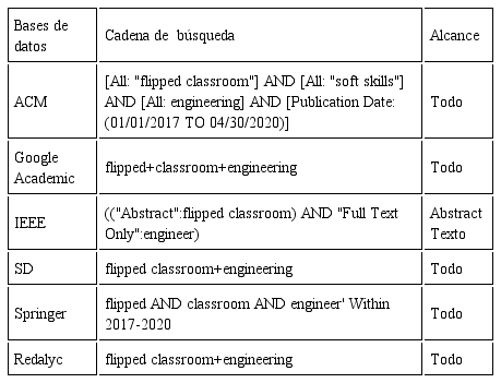 En el caso particular de la fuente de datos Redalyc se incluyen filtros adicionales tales como: educación, psicología, ingeniería, y varios no especificados exactamente; para ajustar la búsqueda a los objetivos propuestos. Para la fuente de datos de Google Academic se filtraron artículos únicamente en español y no se incluyeron citas y patentes con el fin de que la búsqueda arroje resultados acordes a los objetivos de la investigación.