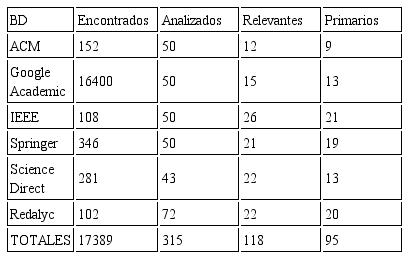 En la cuarta columna se indica la cantidad de artículos relevantes, es decir, aquellos que han pasado por los criterios de inclusión y exclusión. Este proceso se realizó teniendo en cuenta título y abstract de los artículos. Se seleccionaron solo 118 artículos, de estos últimos se encontraron 2 repetidos, por lo cual el total a analizar con lectura completa es de 116. Luego, al realizar la lectura completa de los artículos se puede aplicar nuevamente criterios de exclusión, por lo cual la cantidad de estudios primarios es de 95 como se muestra en la columna cinco.