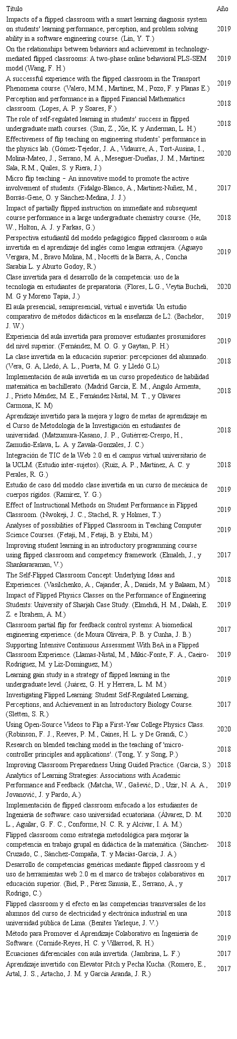 La segunda columna de la tabla 2 muestra los resultados de cada base de datos; la tercera columna muestra los resultados analizados, donde se consideró en la mayoría de las bases de datos los primeros 50, teniendo en cuenta la cantidad de resultados obtenidos y que los mismos se encuentran filtrados por relevancia. En el caso de Redalyc, se consideraron 72 resultados, ya que fueron incluidas aquellas disciplinas relacionadas con el estudio (educación, psicología, entre otros). En el caso de Science Direct, únicamente 43 resultados, que fueron los que cumplieron las siguientes condiciones: “Flipped Classroom” en título y abstract + “engineering” en texto completo.