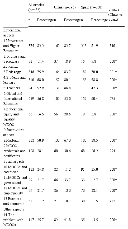 In the second phase of thematic analysis, the articles were coded by different countries, China (n=196, 41.8%) and Spain (n=273, 58.2%), using the same coding framework that includes 14 themes that have established later to identify the characteristics and presentation of the MOOCs in different countries. Ten themes out of the 14 themes mentioned in the Chinese articles (n=196) differed significantly from the Spanish articles (n=260).