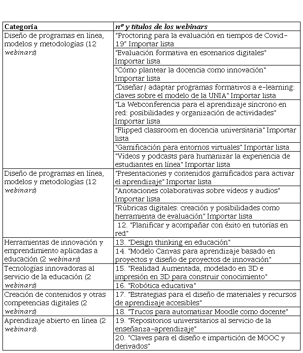 Fueron 20 webinars los diseñados según lo anterior, impartidos entre junio de 2020 y febrero de 2021. Los primeros se centraron en atender cuestiones “urgentes”, como el modo de evaluar en línea dada la cercanía de los exámenes finales, claves para planificar y adaptar programas formativos a e-learning, o posibilidades educativas de la webconferencia y consejos para organizar e impartir ante la cámara sesiones síncronas en línea. El ciclo concluyó con algunos seminarios orientados a explorar formas y tendencias sobre aprendizaje abierto en línea. Se establecieron, así, cinco grupos o categorías para clasificar los seminarios de 2020-21 (ver tabla inferior):