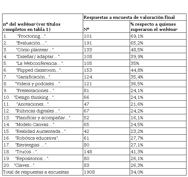 Del total de participantes, cumplimentaron los cuestionarios de valoración algo más de 1900 personas (ver tabla inferior). Si bien podría entenderse como una muestra reducida, podemos considerarla válida interpretándose respecto al número de personas que superó cada webinar en lugar de a la cantidad de inscritas.