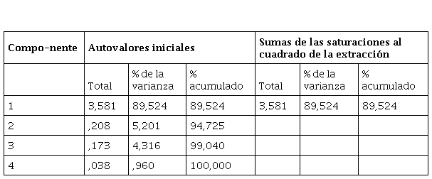 Se realizaron los siguientes análisis: determinación de la matriz de correlaciones; índice KMO (Kaiser-Meter-Olkin) o medida de adecuación de la muestra; y test de esfericidad de Barlett. El índice KMO se interpreta de manera semejante a los coeficientes de confiabilidad, vale decir, con un rango de 0 a 1 y tomando como adecuado un valor igual o superior a 0,70, el cual sugiere una interacción satisfactoria entre los ítems (Hair et al., 1999), obteniendo en nuestro estudio un valor de 0,818. En el caso de que el índice KMO sea satisfactorio podemos utilizar el modelo de extracción de factores de componentes principales que consiste en llevar a cabo la combinación lineal de todas las variables de modo que el primer componente principal sea una combinación que explique la mayor proporción de varianza de la muestra, la segunda mayor y así sucesivamente. El objetivo es encontrar un reducido número de componentes que expliquen el máximo de varianza total de las variables originales.