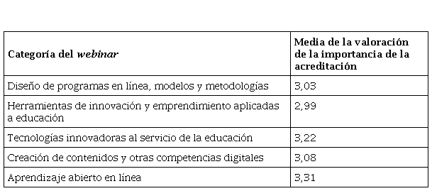 Por último, se analizaron cuantitativamente las posibles diferencias de medias en las valoraciones de ponentes y de la acreditación en función de las cinco categorías de webinars fijadas. Para ello se utilizó el test ANOVA junto con el HSD de Tukey, obteniéndose que las diferencias de medias respecto a las categorías de webinars no son significativas en ambos casos por obtener valores de significación mayores que 0,05. Más concretamente, en la tabla de medias de la valoración de la importancia de la acreditación en función de las cinco categorías de webinars establecidas se observa que las diferencias entre ellas no son significativas, lo que confirma el análisis de ANOVA y el HSD de Tukey mencionado.